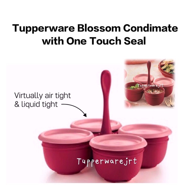 Tupperware brings to you the all new blossom condimate with lid set to help solve all your storage problems so that you don t have to struggle to find an efficient and feasible way of doing so it is made up of virgin plastic so you can store your edible products easily and efficiently with no concerns for hygiene or your family s health. Makin cantik dan mewah jika disandingkan dengan ragam wadah saji lainnya berwarna senada dari tupperware. Tupperware blossom condimate set. Tupperware blossom condimate set.