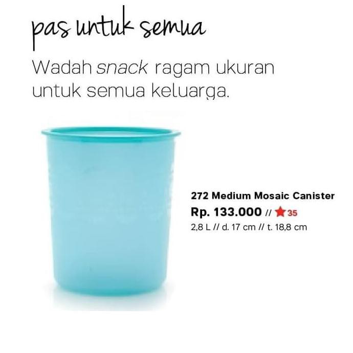 Medium mosaic canister tupperware merupakan toples tupperware yang ada dalam katalog promo tupperware terbaru 2017 hadir dengan warna baru produk ini sangat cocok untuk digunakan sebagai tempat menyimpan aneka snack. Tupperware medium mosaic canister ungu rp88 200 jakarta barat tupperwaretermurah tambah ke wishlist tupperware giant canister 1pcs ungu corak flower rp154 350 jakarta barat tupperwaretermurah 7 tambah ke wishlist tupperware fortune bird. Beli mosaic canister medium di official store tupperware indonesia. Tupperware menjawab kebutuhan tersebut dengan medium mosaic canister yang dapat menunjang kebutuhan penyimpanan dengan wwarna turquoise yang modern.