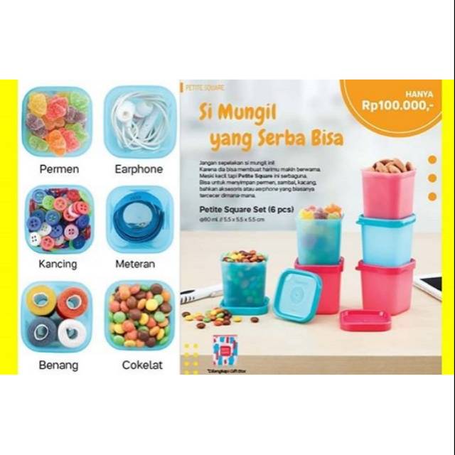 Wa 087837805779 agen tupperware kebumen tupperware petite square set 6 wadah imut dalam brosur promo tupperware november 2017 ini sangat bermanfaat untuk membawa bekal yang berukuran kecil seperti snack kacang meses dan lain sebagainya. Di iprice daftar harga penyimpanan tupperware yang ditawarkan mulai dari idr rp 30 000 hingga idr rp 1 500 000. 90 000 diskon 30 jadi rp. Jual tupperware promo petit square set 80ml dengan harga rp70 000 dari toko online twinstar collection jakarta barat.