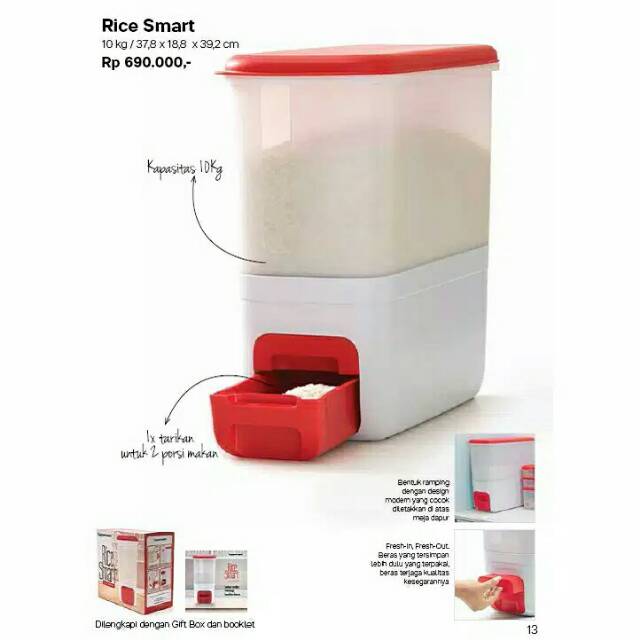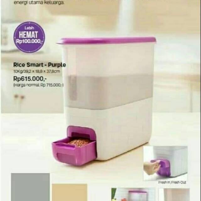 Tupperware rice smart dispenser memperkenalkan inovasi baru penyimpanan beras. Rice smart tupperware merupakan sebuah alat yang digunakan untuk menyimpan beras. Desain yang compact dan ramping dapat diletakkan langsung di atas meja dapur tampilan yang modern dan elegant menyempurnakan dapur anda dengan sistem fresh in fresh out memastikan agar beras anda selalu terjaga kesegarannya.