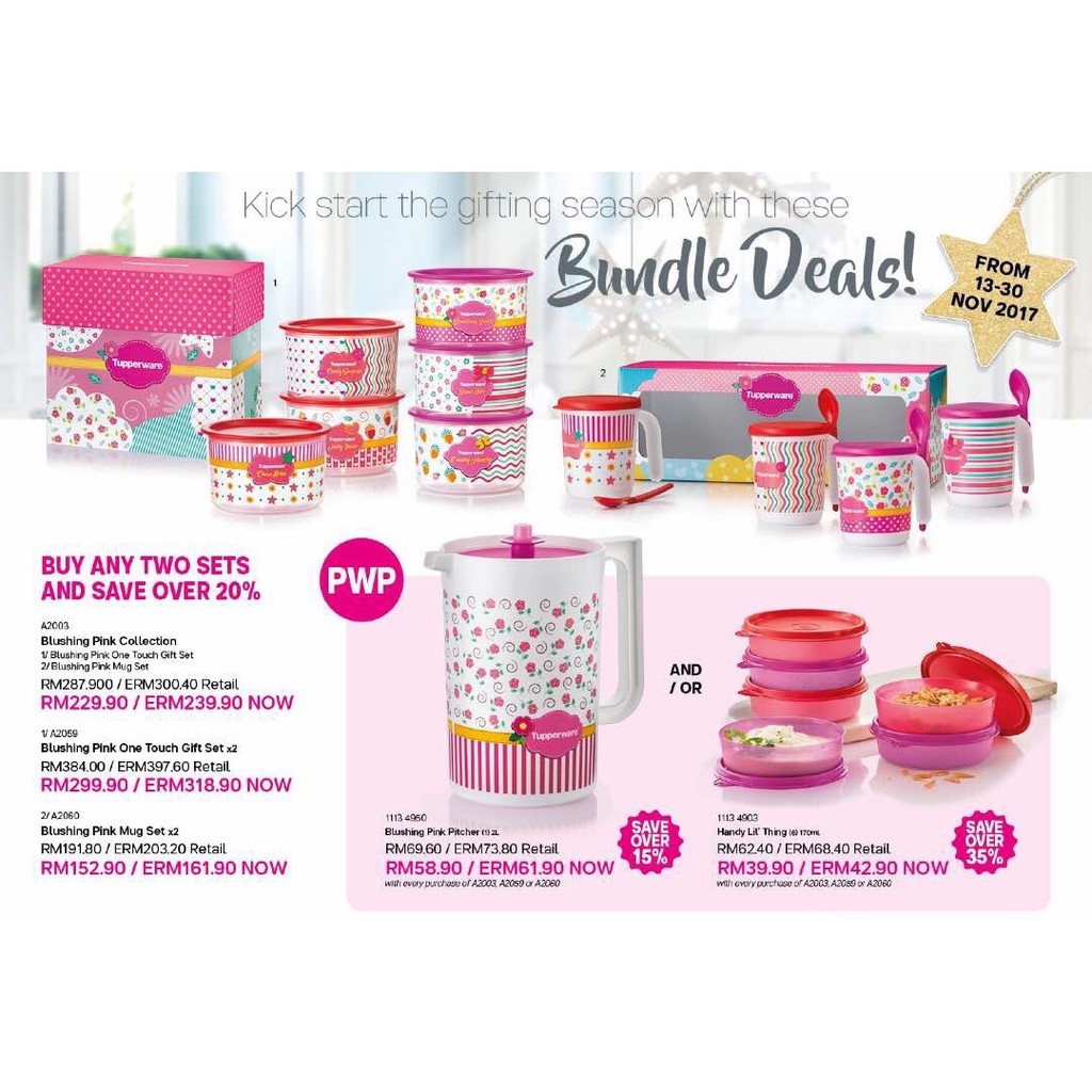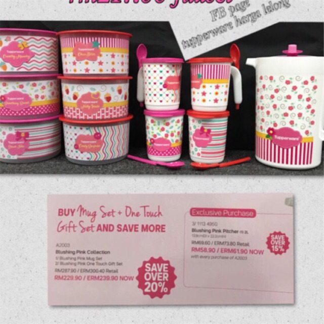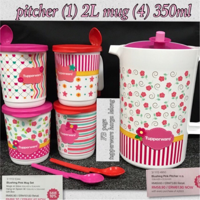 1 blushing pink pitcher 1 unit 11134950 2l now at rm58 90 worth rm69 60 or 2 handy lil thing 6 units 11134903 170ml now at rm39 90 worth rm62 40. 11134950 blushing pink pitcher 1 2l. This can be used to serve hot or cold drinks. Details about tupperware 2 litre pitcher blushing pink limited edition see original listing.