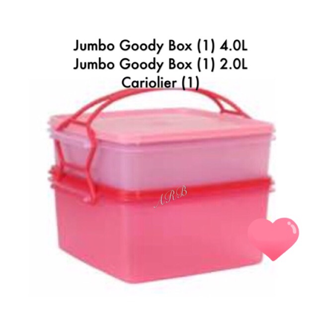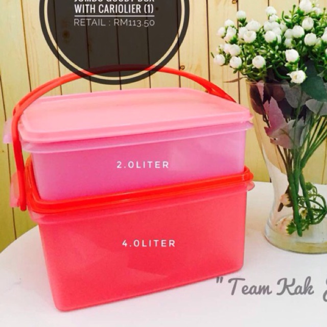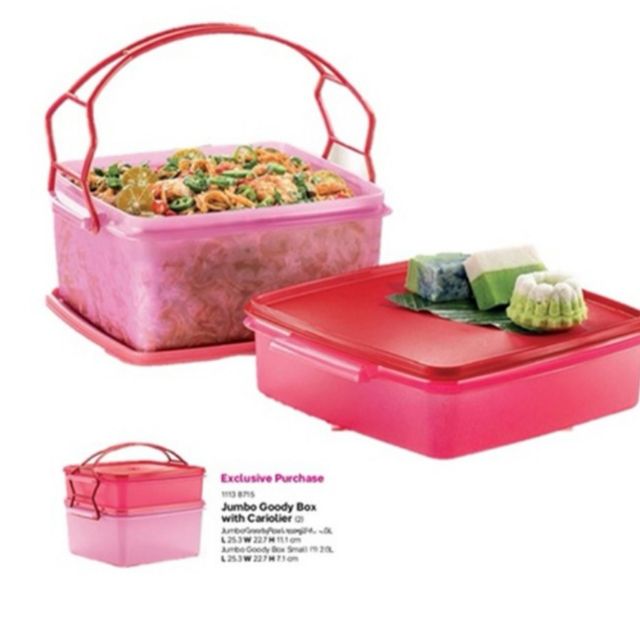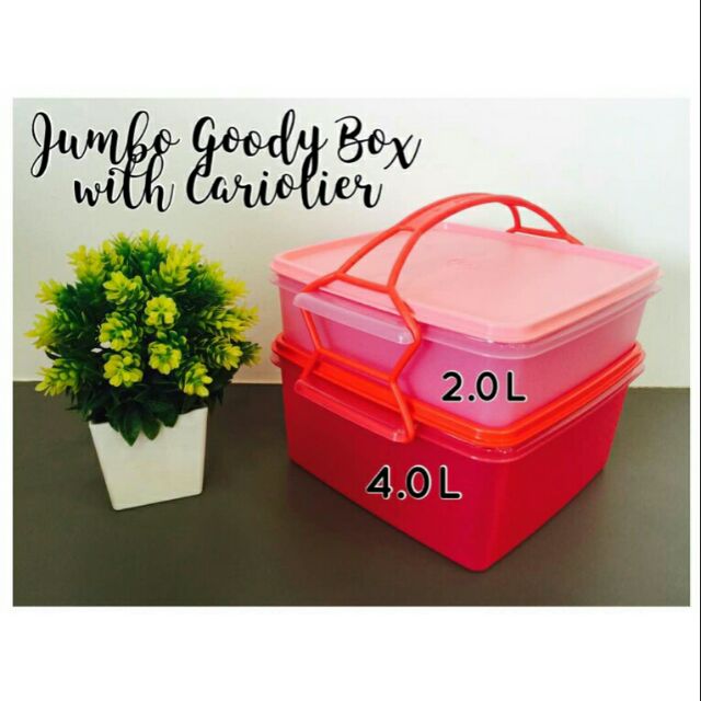 Tupperware jumbo goody box with carolier pink. Page 1 of 1 start over page 1 of 1. 1 x jumbo goody box small 2 0l 1 x jumbo goody box big 4 0l features great for tuppao easy to carry around with the. Jumbo goody box large 1 4 0l l 25 3 w 22 7 h 11 1 cm2.