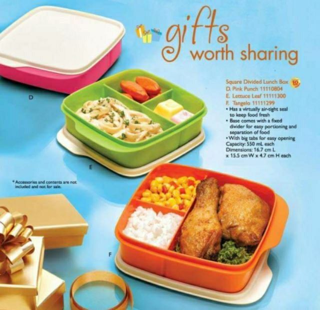 Tupperware lunch box the tupperware lunch box with its multi position divider helps you store your lunch on two levels as well as a division to the side.