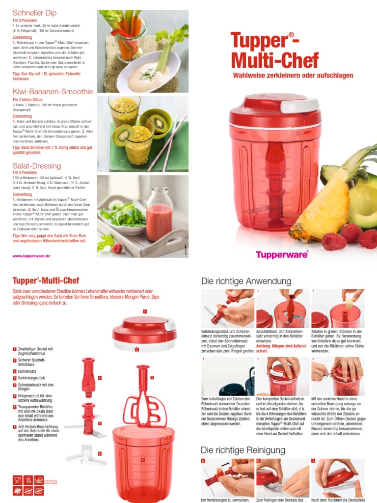 Den quick chef reinigen sie so. Dengan kapasitas tampung 1 3 liter menjadikannya wadah yang cukup besar untuk memotong atau mencampur secara cepat dan menyeluruh. Egal ob als unterstützung beim vorkochen für die woche mealprep oder für den extra vitamin boost durch gesunde smoothies mit dem multi chef hast du den dreh raus. Des weiteren verfügt der quick chef von tupperware über zwei einsätze das messer und der mixeinsatz.