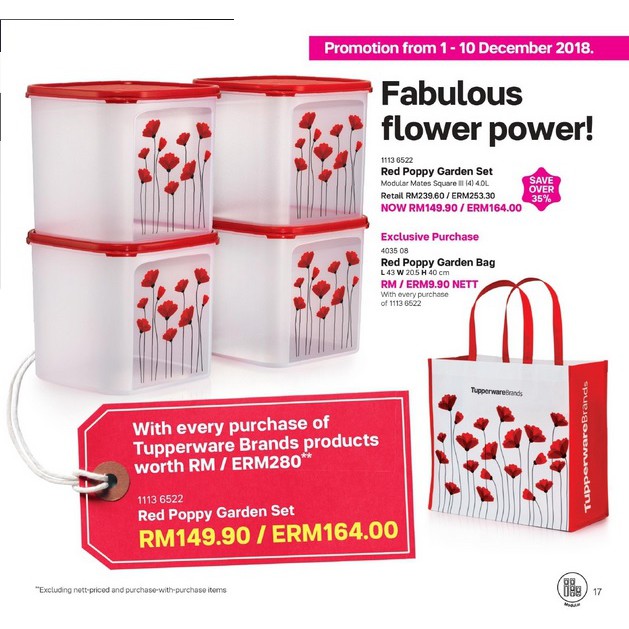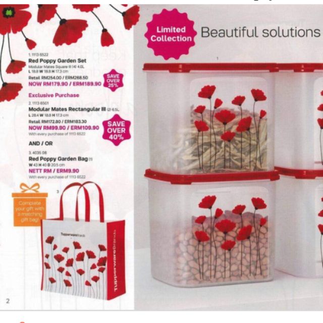 Tupperware red poppy garden set. Yang keluaran khas februari 2018 di malaysia sempena tahun baru cina. Red poppy garden set modular mates square iii 4 4 0l l 18 8 w 18 8 h 17 3 exclusive purchase 1113 6501 modular mates rectangular iii 2 6 5l l 28 4 w 18 8 h 17 3 cm and or 4035 08 red poppy garden bag 1 w 43 h 40 d 20 5 cm. We ve got the modular spice set the return of the much loved universal jar the classy mosaic storages the revolutionary universal cookware and more. Related pages see all.