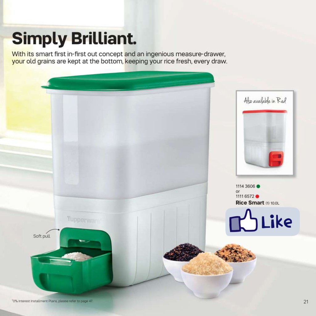 A must have rice keeper for every home the ricesmart tupperware rice dispenser preserves the freshness of rice with the first in first out rotation method to nourish families at every meal. Heart a product to add it to your wishlist. Tupperware ricesmart 10kg rice dispenser 11116572. Browse products and create a wishlist you ve seen the catalogue now you can browse the online product gallery for more product details including size specifications demo videos and use and care info.
